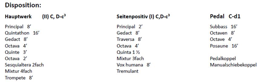Bei Papenius ist der Prinzipalchor von 8‘ bis zur Mixtur immer vollständig disponiert; ferner fehlt nie die für ihn und seine Schule typische Flauto travers 8‘ wie auch Vox humana 8‘ im Diskant.